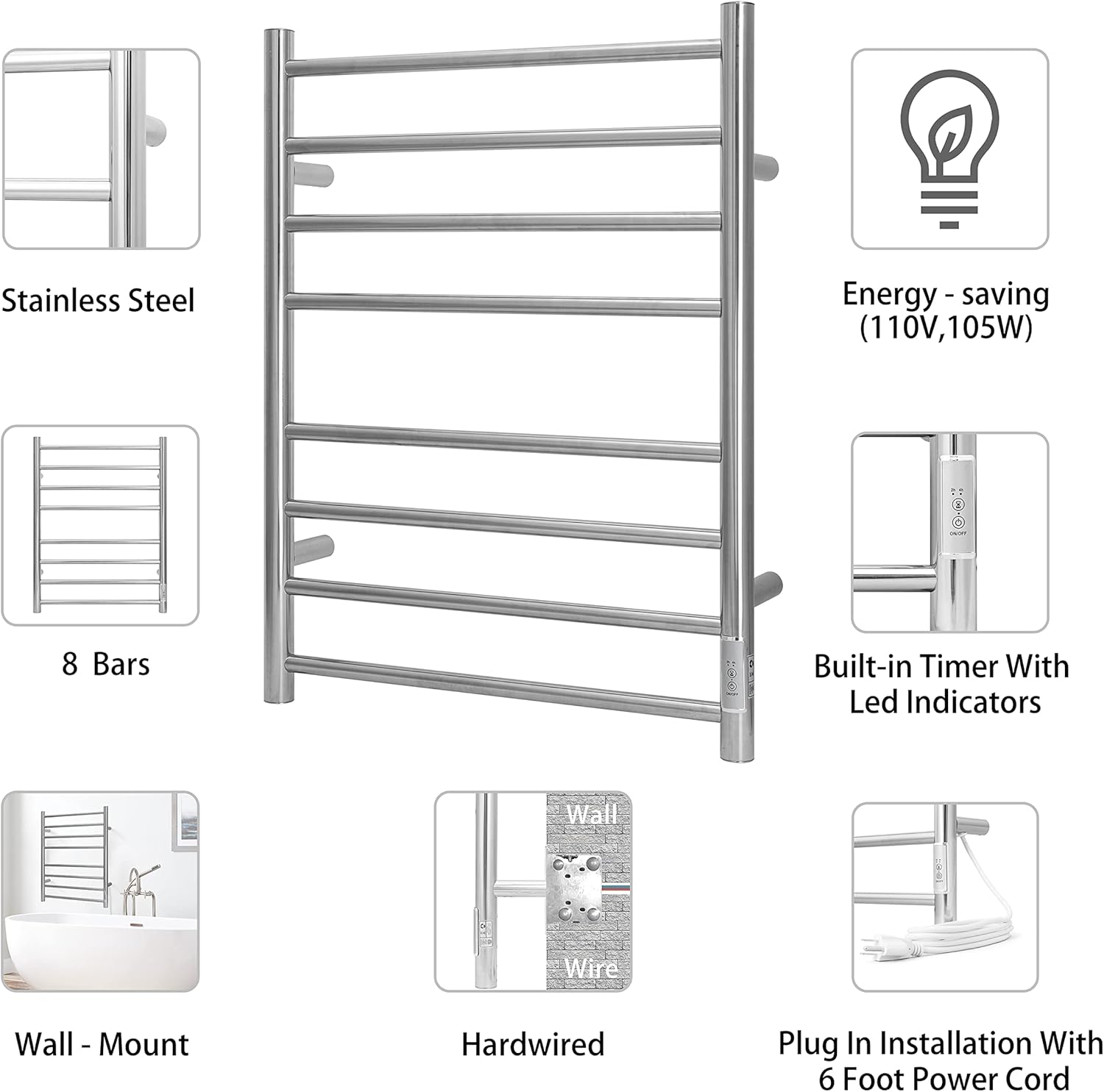 - Premium Quality with Elegant Look: The bath towel warmer is made of durable 304 stainless steel, easy to clean and durable use. IP56 Waterproof standard and wall-mounted design maximizes your floor space.