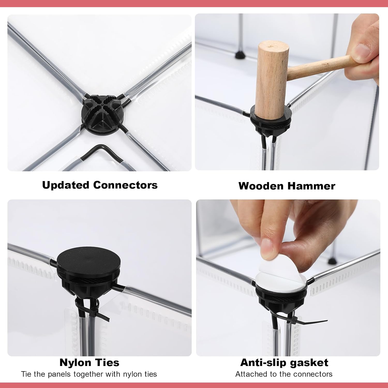 - [Pet Playpen Package]: Each set includes 12pcs transparent panels, 50pcs nylon cables, 24pcs connectors,12pcs non-slip mats,1pc wooden hammer, 1pc User manual. This small animal playpen offers a spacious and secure area for your furry friends to play and exercise. Assembled size can be 48" x 24" x 16".