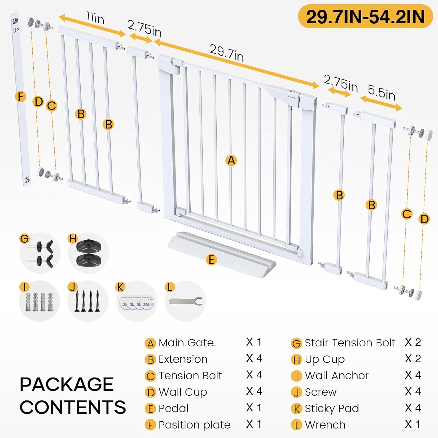 - EXTRA-WIDE GATE COVERAGE β With a height of 30.5 inches and an adjustable width of 29.7 to 54.2 inches, this wide baby gate lets you block off stairways, bedroom doors, hallways, and other off-limit areas inside your home for better child or pet safety. A great choice for new parents