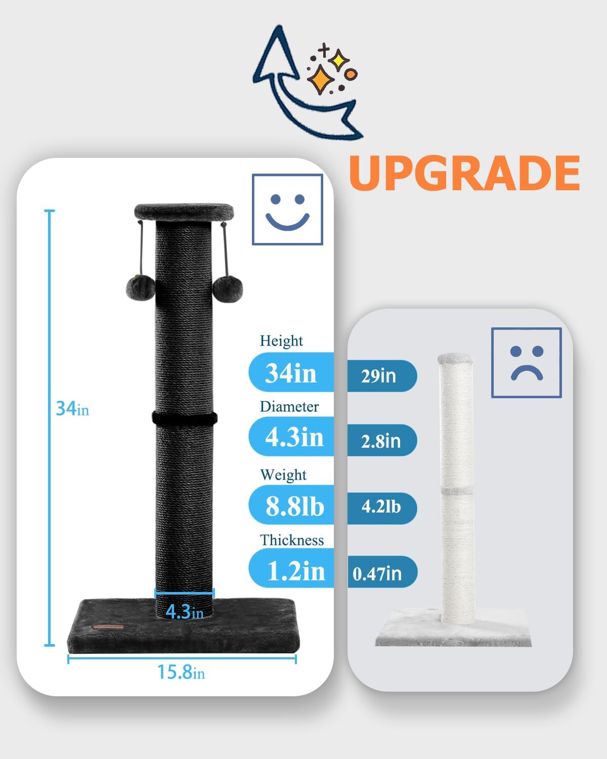 - Tall and Sturdy: Our 34-inch tall cat scratching post is designed to provide ample height for cats to stretch and scratch comfortably. The sturdy construction ensures stability during vigorous scratching sessions, making it a durable choice for indoor cats of all sizes and ages.