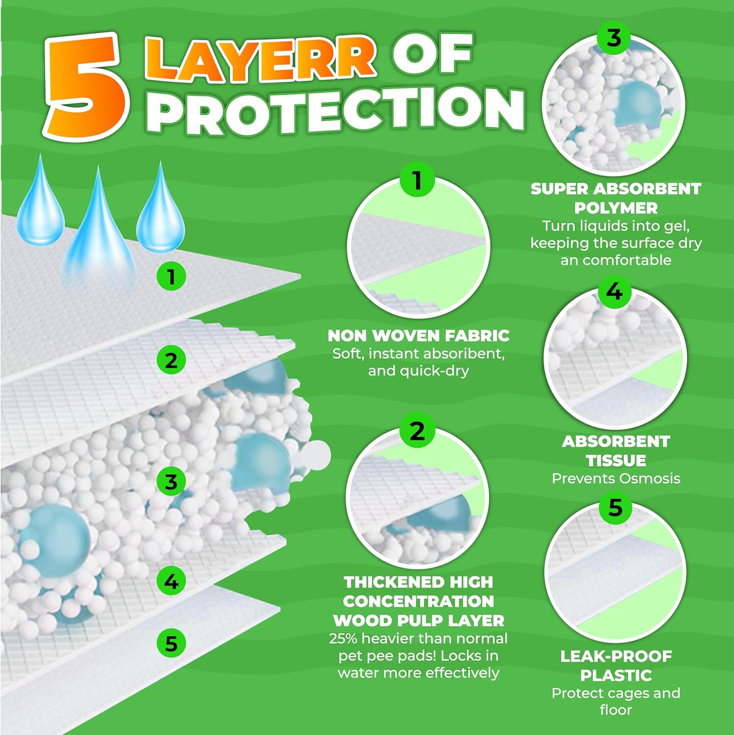 - [SUPER ABSORBENT] The soft, quilted top and sturdy inner layer absorb moisture, and the leak-proof bottom ensures your pet’s cage stays dry and comfortable