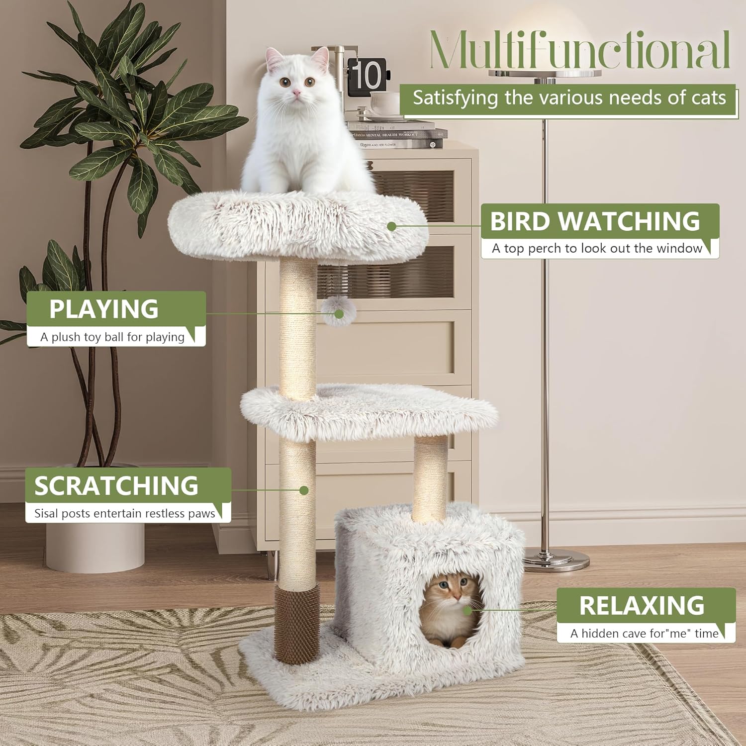 - 😺【Protects Your Furniture】Say goodbye to scratched-up sofas and beds! This cat tree is equipped with multiple scratching posts and a board to satisfy your cat's scratching needs. The fluffy little house will keep your kitty feeling cozy and secure.